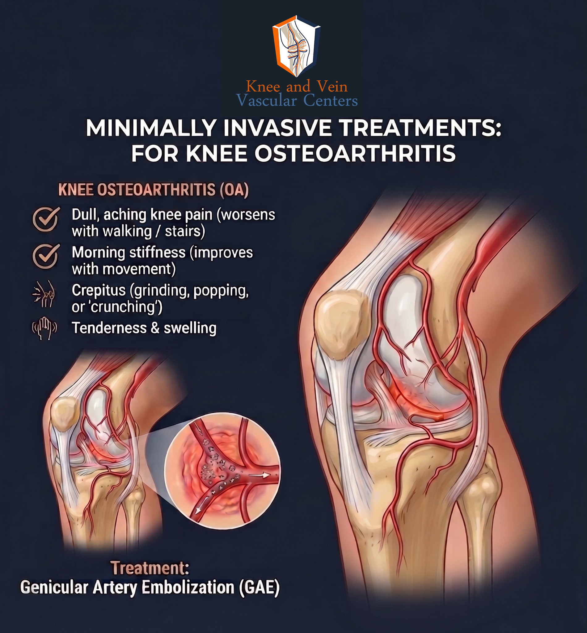 GAE is a minimally invasive, image-guided procedure that targets the inflammation responsible for knee pain in osteoarthritis. The procedure works by blocking abnormal blood vessels around the knee that contribute to chronic inflammation and pain.